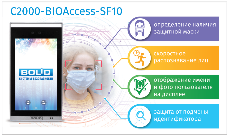 В другом случае контроллер С2000-BIOAccess-SF10 может быть добавлен в действующую систему ИСО "Орион" в точках доступа (дверь, турникет), которые уже управляются штатным прибором С2000-2 с использованием Proximity-карт. В этом режиме "С2000-BIOAccess-SF10" будет не только формировать сообщения об отсутствии медицинской маски, но и не пропускать человека, если его лицо не идентифицировано с положительным результатом или он пытается осуществить проход без маски. Это позволит организовать более надежный биометрический контроль доступа, а также исключить проход в зоны, где нахождение в маске обязательно, что минимизирует поводы для оформления штрафов от надзорных органов.