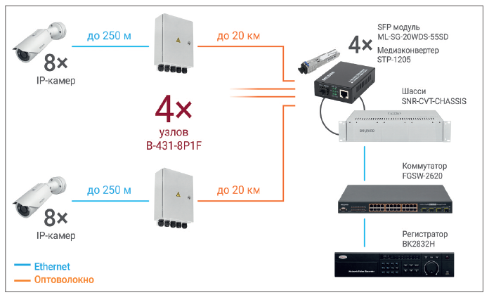 Решение позволяет произвести подключение камер и самого узла к оптоволоконной сети без приобретения дополнительных расходников: