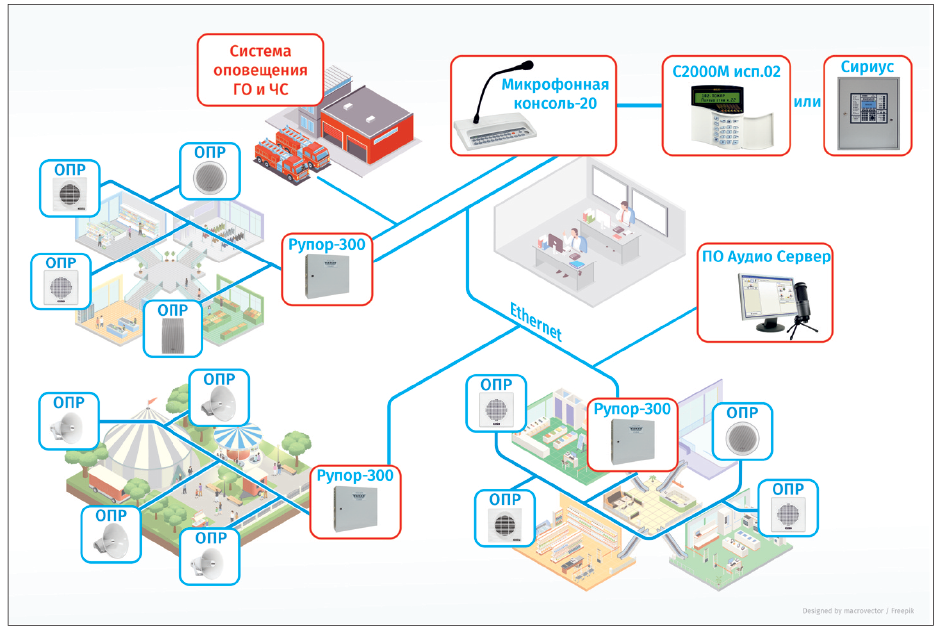В интегрированной системе охраны ИСО "Орион" производства НВП "Болид" СОУЭ 4 – 5 типов рекомендуется проектировать по блочно-модульному принципу построения приборов управления. Ключевыми компонентами в этом случае будут блок речевого оповещения "Рупор-300" с оповещателями и пульт контроля и управления "С2000М исп.02" либо прибор приемно-контрольный и управления пожарный "Сириус". Линии связи между компонентами блочно-модульного ППУ СОУЭ используют резервируемый интерфейс RS-485 (два порта), что позволяет устанавливать "Рупор-300" непосредственно в зонах оповещения. В результате значительно сокращаются затраты на кабельные линии по сравнению с "классическими" стоечными системами оповещения, в которых ППУ СОУЭ размещены на пожарном посту.