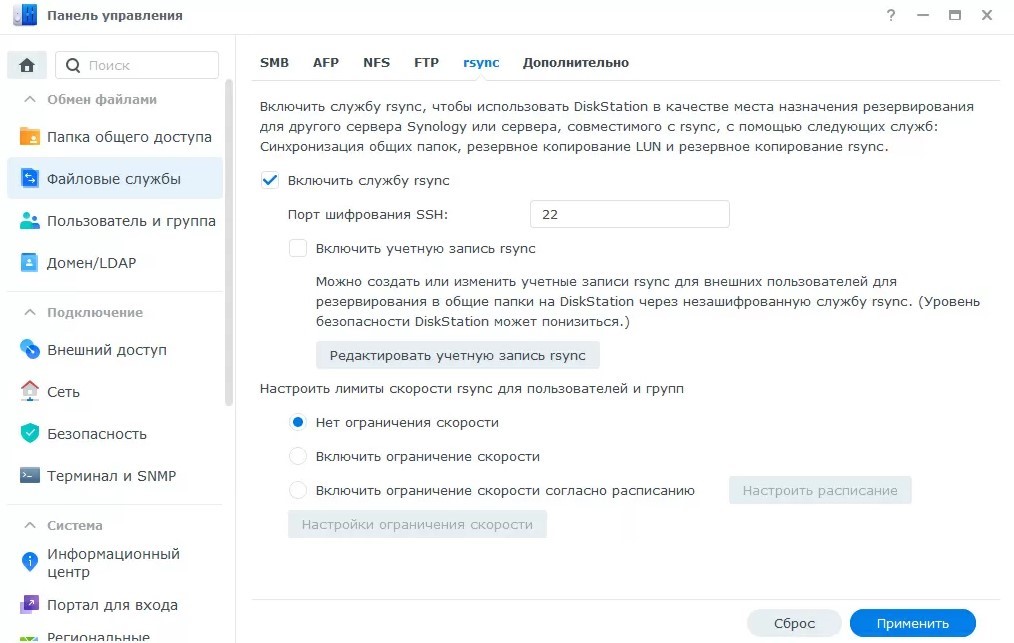 Обратите внимание: включение RSync и SFTP не означает включение терминального доступа по SSH, и если последний отключен, а первые два включены, то при подключении через терминал соединение будет разорвано.