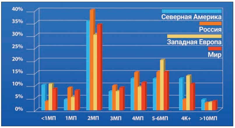 Статистика по миру фиксирует следующие тенденции для разрешений камер: небольшое снижение доли 1, 2 и 3 МП и увеличение камер 4K+.