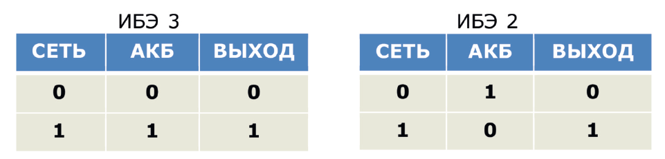 У ИБЭ 3 при разряженной батарее световой индикатор "БАТ" светится, а у ИБЭ 2, наоборот, при разряженной батарее световой индикатор "АБ" не светится. Представим, что в организации в помещении дежурного поста оказались оба варианта ИБЭ. Для большей наглядности с помощью одной таблицы истинности алгебры логики (табл. 2) по срабатыванию трех световых индикаторов определим состояния СЭС СОБ (питающей сети, АКБ, ИБЭ 2 или ИБЭ 3) при включенном выключателе "СЕТЬ" и исправности всех СИ. При этом сигнал логического "0" означает, что световой индикатор не светится, а сигнал логической "1" означает его свечение.
