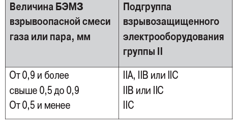Таблица 7. Сопоставление величины БЭМЗ взрывоопасной смеси газа или пара и подгруппы взрывозащищенного электрооборудования группы II