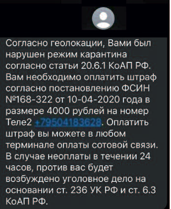 Вторым примером адаптированных под современные реалии мошеннических схем стала точечная СМС-рассылка злоумышленниками сообщений о начисленных штрафах за нарушения режима карантина или несанкционированное перемещение по городу. Жертве предлагается в кратчайшие сроки оплатить штраф путем перевода денежных средств на подконтрольный злоумышленникам номер телефона.