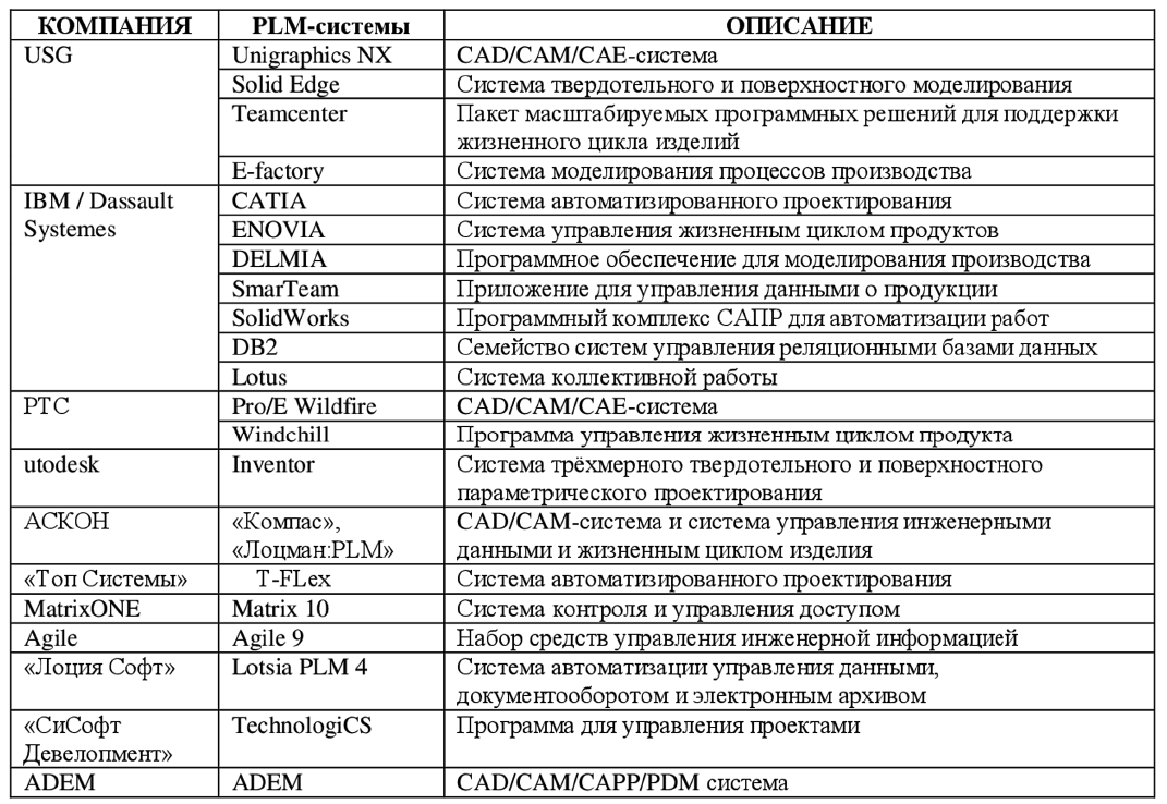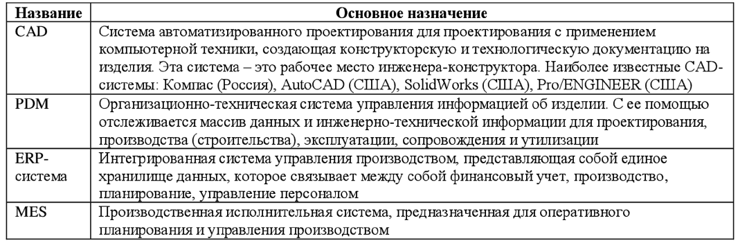 Назначение PLM-концепции – интегрирование для эффективного взаимодействия изолированных производств, образовавшихся в результате внедрения различных систем, таких как CAD, PDM, ERP, MES (табл. 1).